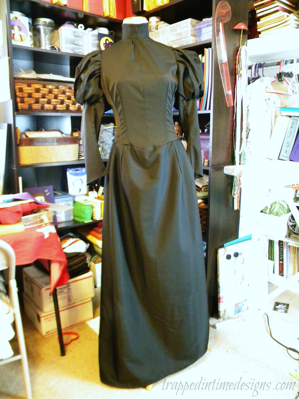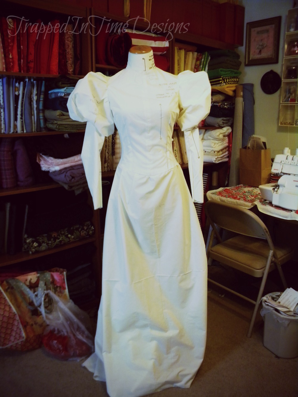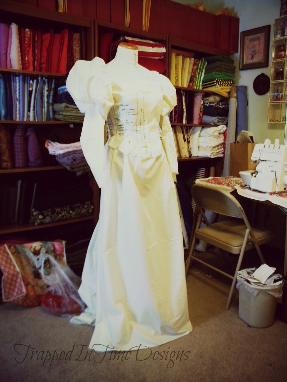 I only have the dress photographed (and poorly at that) so far.  Note the dress form she’s on is slightly too small….