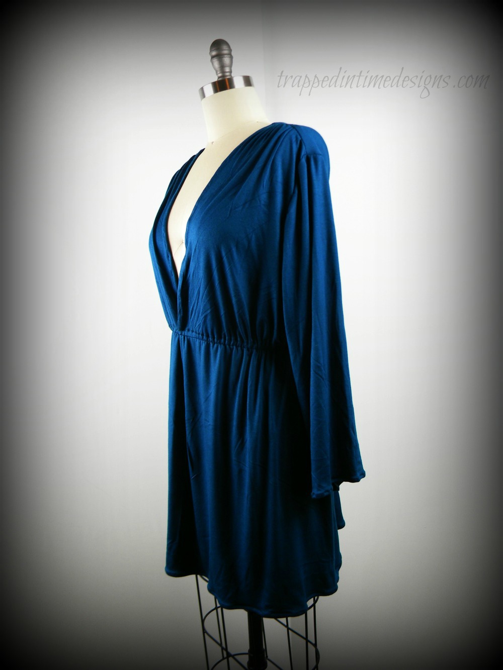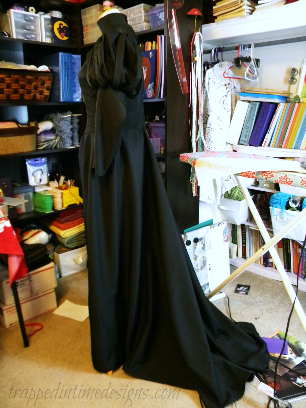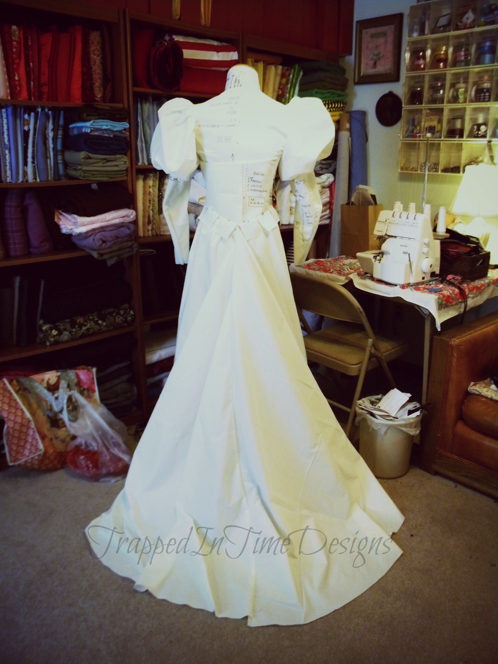 I only have the dress photographed (and poorly at that) so far.  Note the dress form she’s on is slightly too small….