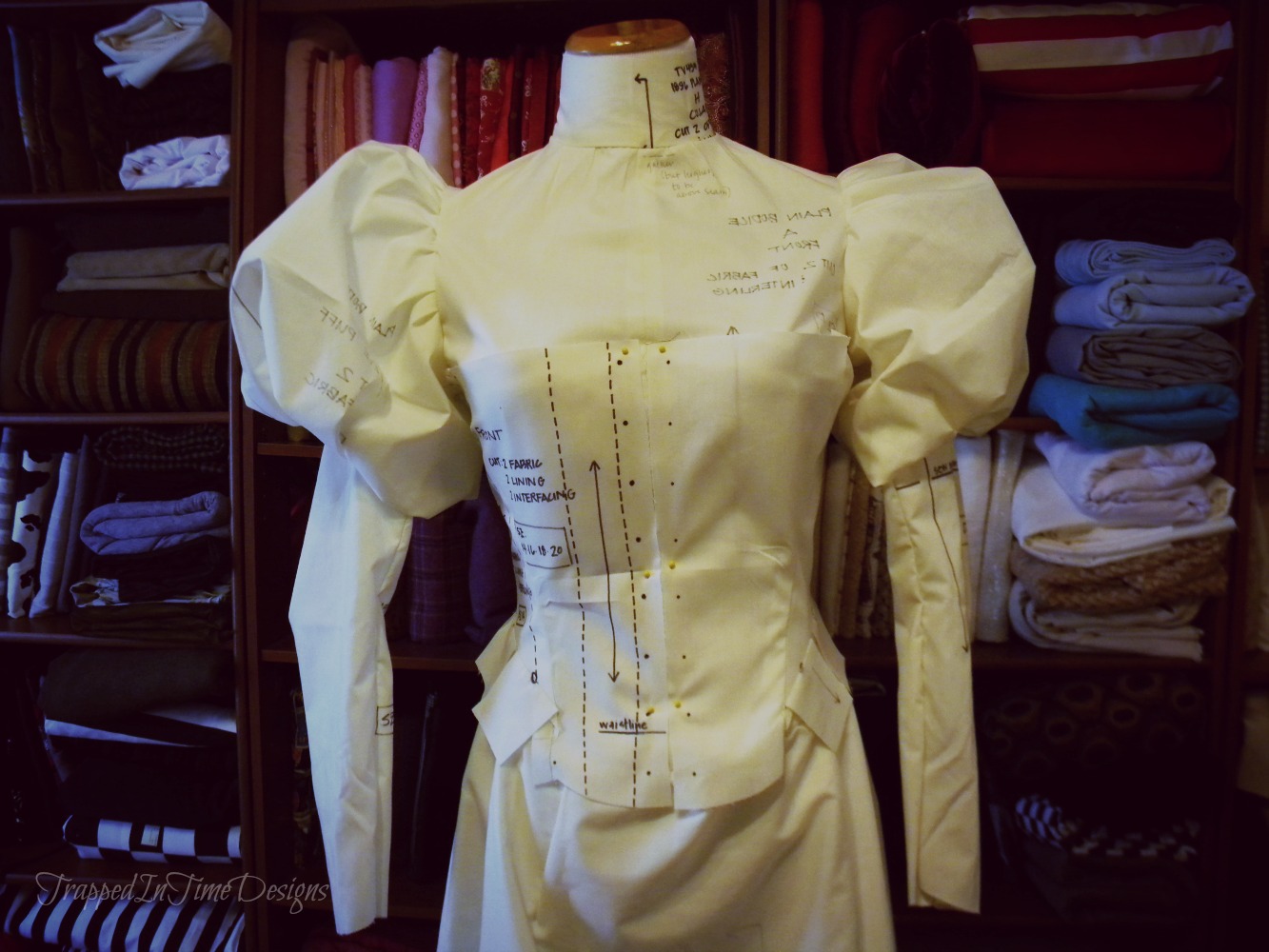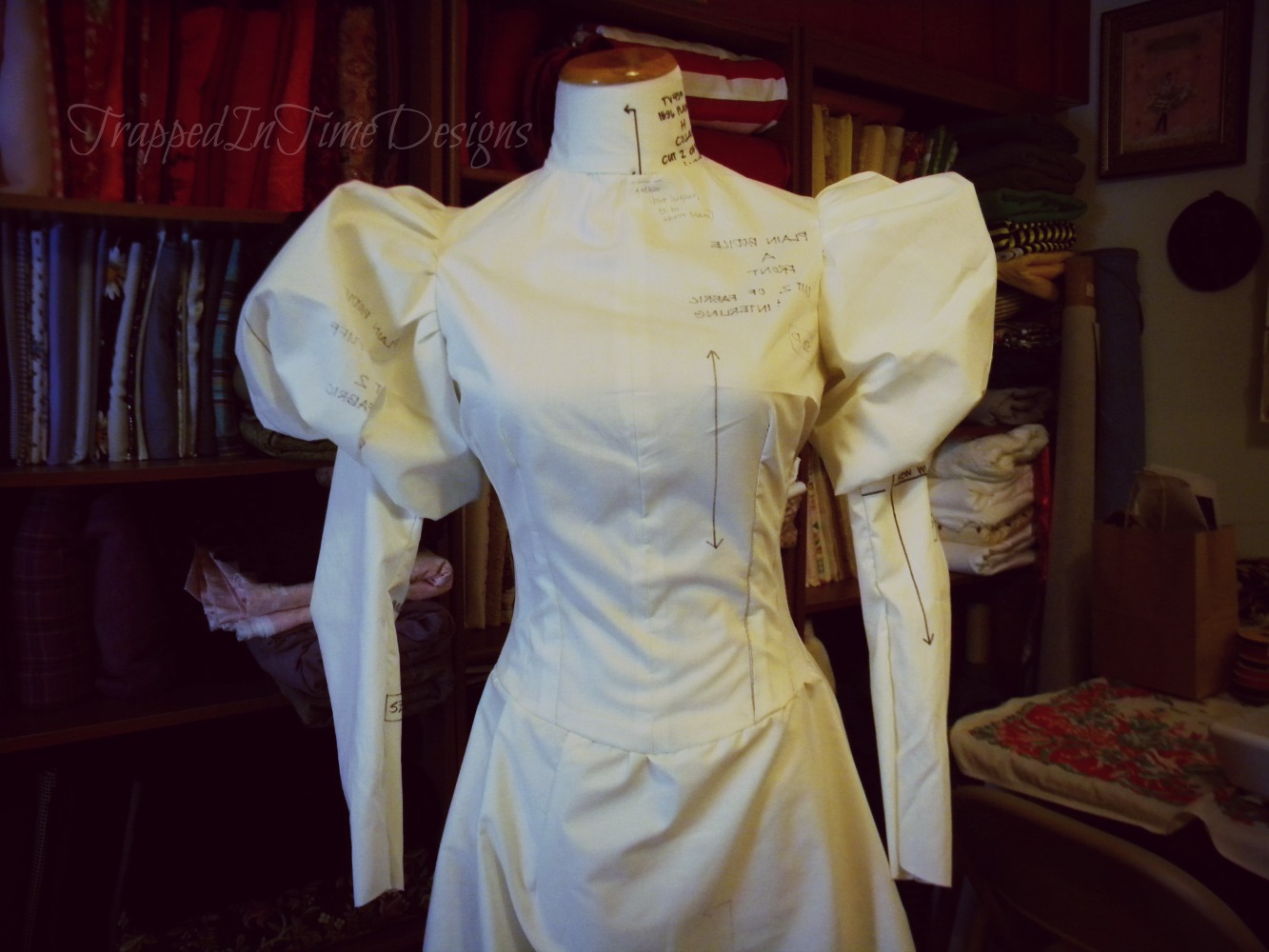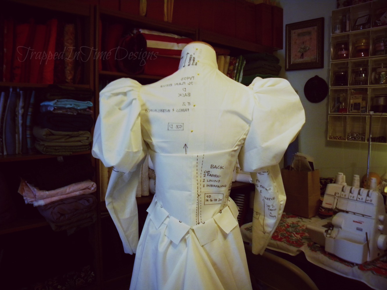 There are a few tweaks to make for the customer before I start on the real fabric.  The sleeves need to have less puff, the corset needs to be a wee bit shorter.  Nothing too substantial.