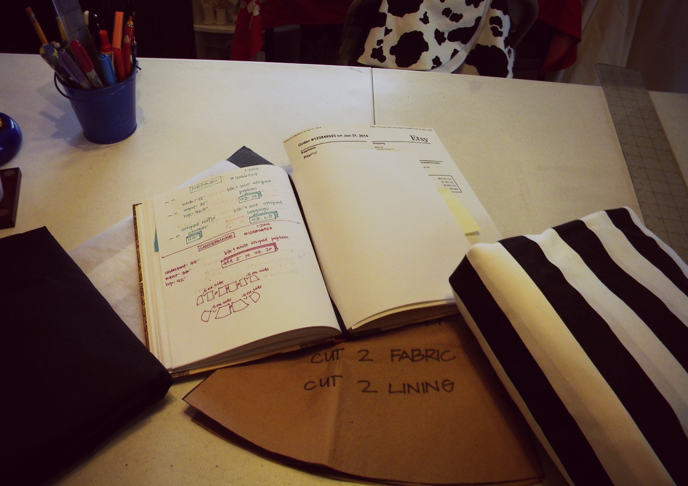 Today I’ll be sewing up one last order that’s cut, and cutting a few more that are waiting.