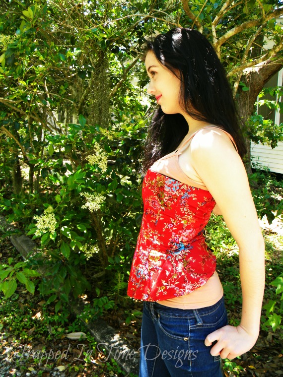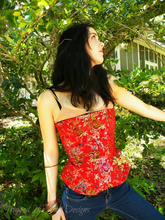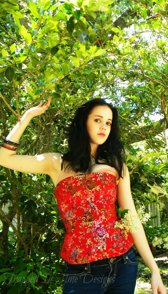 This is a beautiful red silk-blend floral brocade bustier that is a relatively recent addition to the shop (I’m still swamped with custom orders right now, so new items are on the back burner right now). It’s really quite beautiful in person. I do have a bit of a weakness for brocades, especially when it’s an Asian print.