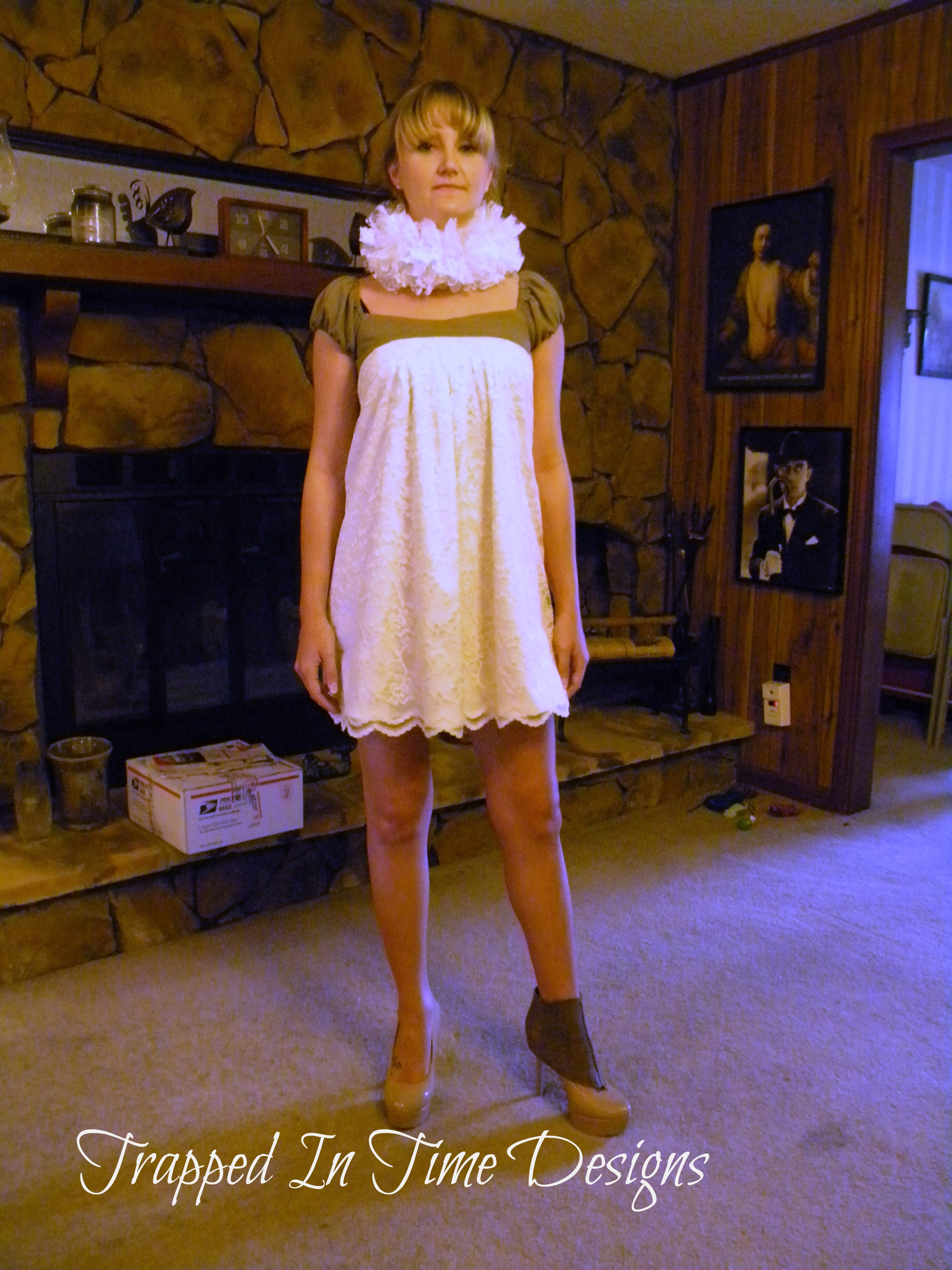I re-purposed some mens dress-slacks (wool) for the very top of the tunic. There is an under-lining to the tunic, and I used a really lovely cream moleskin–so soft–that kind of gets lost under the beautiful lace. I cut this so that I could take full advantage of the scalloped edging on the lace. The tunic has a zip-back for closure.